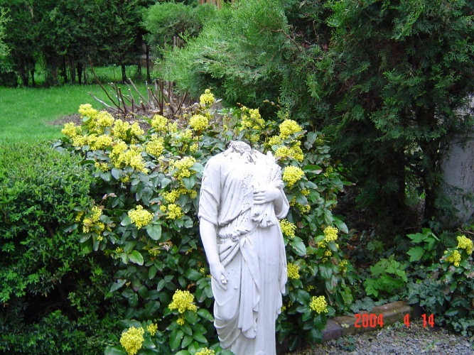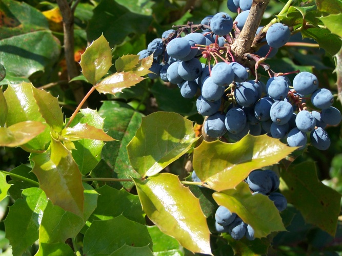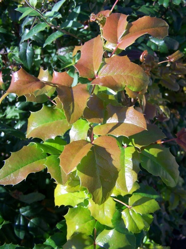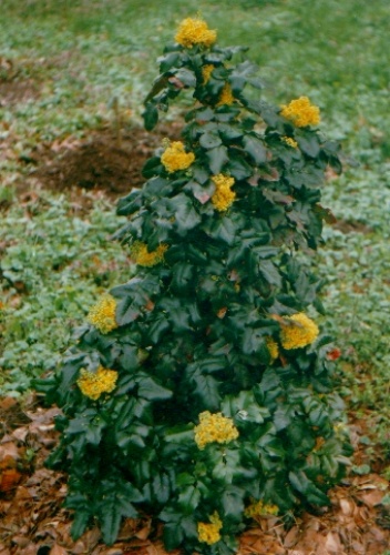 Descriere: arbust cu crestere erecta, pana la 1 m inaltime, formeaza o tufa larga, cu frunze persistente, verde lucios care devine toamna rosu purpuriu. Foliolele au marginile sinuat-spinoase. Foarte decorativ prin florile mici, galben-aurii, usor parfumate, dispuse in raceme fasciculate, erecte, terminale si apar in martie- aprilie. Sunt urmate de fructe decorative, mici (0,8 cm) , sferice, albastrui, brumate.