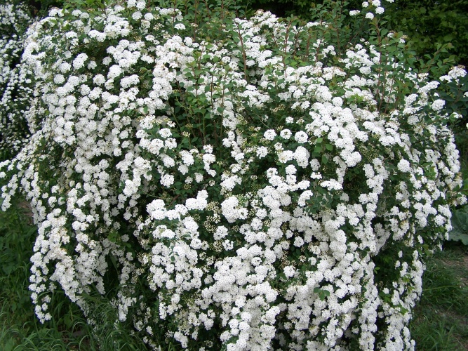 Descriere: arbust viguros de pana la 2 m cu ramuri arcuite si frunze rombic-ovate, verde inchis cu reversul verde albastrui. Decoreaza prin abundenta infloririi, florile mici, albe, grupate in corimbe numeroase, imbraca toata lungimea ramurilor care se arcuiesc mai tare sub greutatea florilor. Infloreste in mai-iunie.